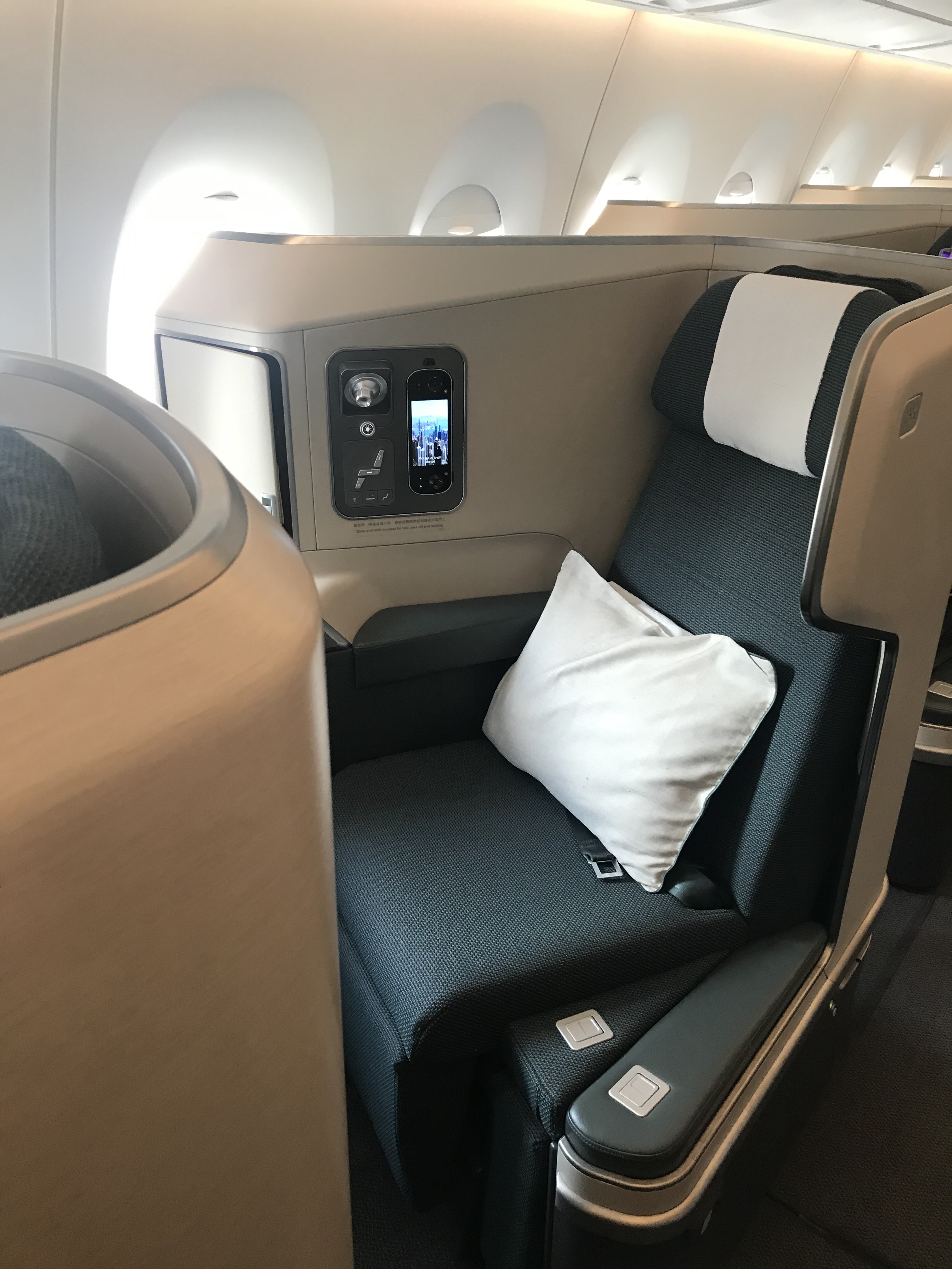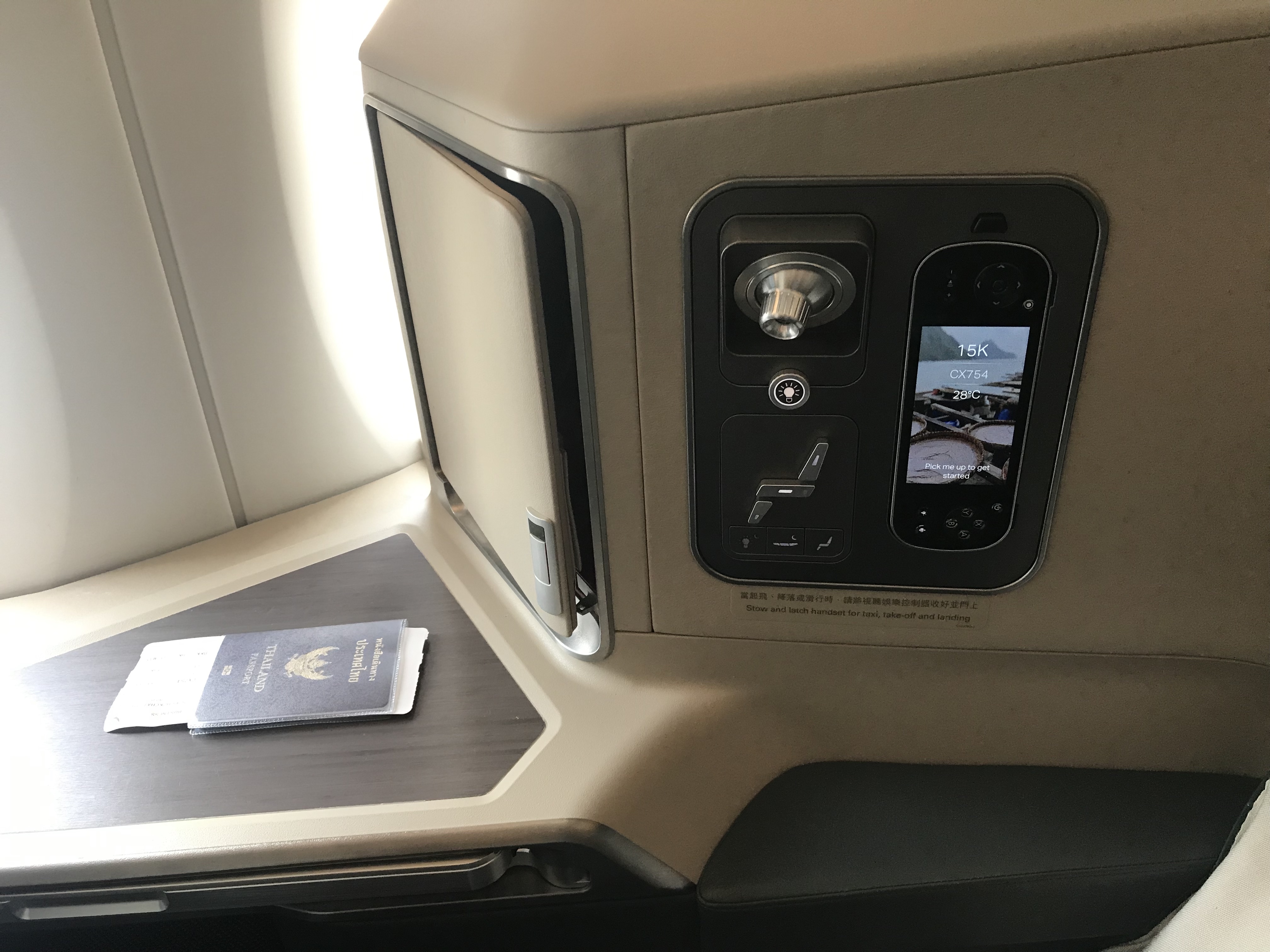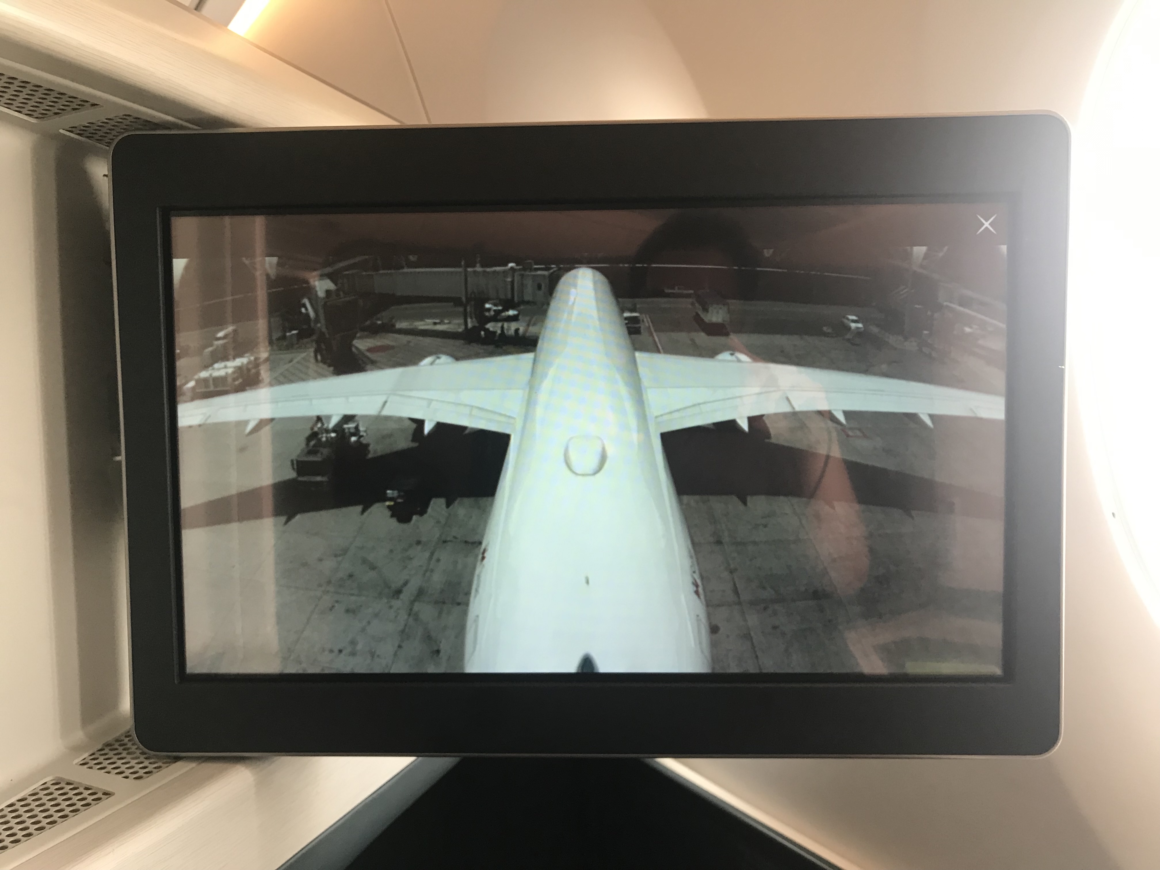 Cathay Pacific’s A350 came with a slightly updated version of their reverse herringbone Business Class seat. I found this seat to be incredibly private. I also liked the small henge they had in the footwell as it allows me to rest my foot there. The entertainment screen was large, clear, and responsive. Being able to watch the airshow on the handset was also a nice feature. Of course, any planes equipped with an on-board camera is always appreciated.