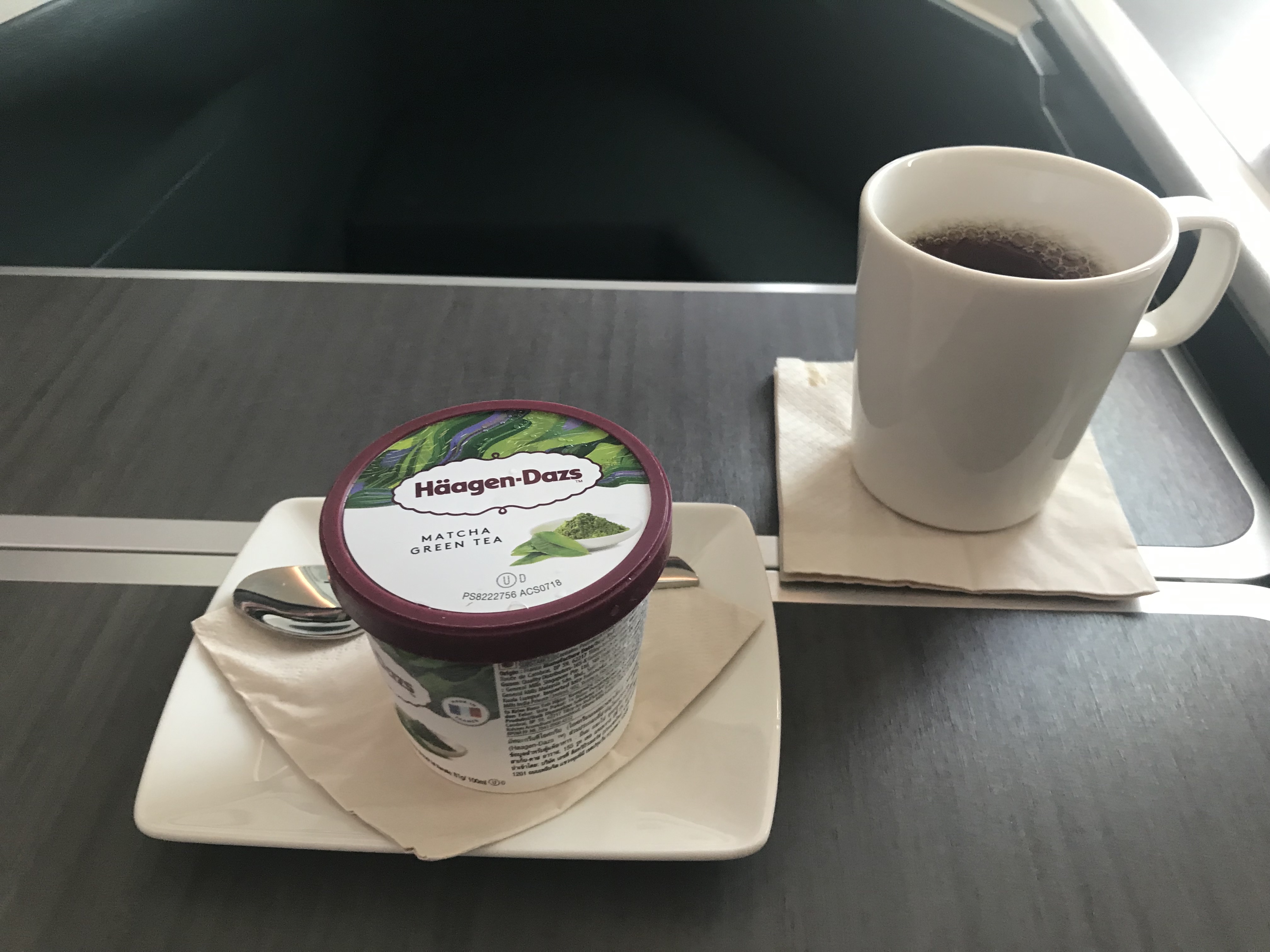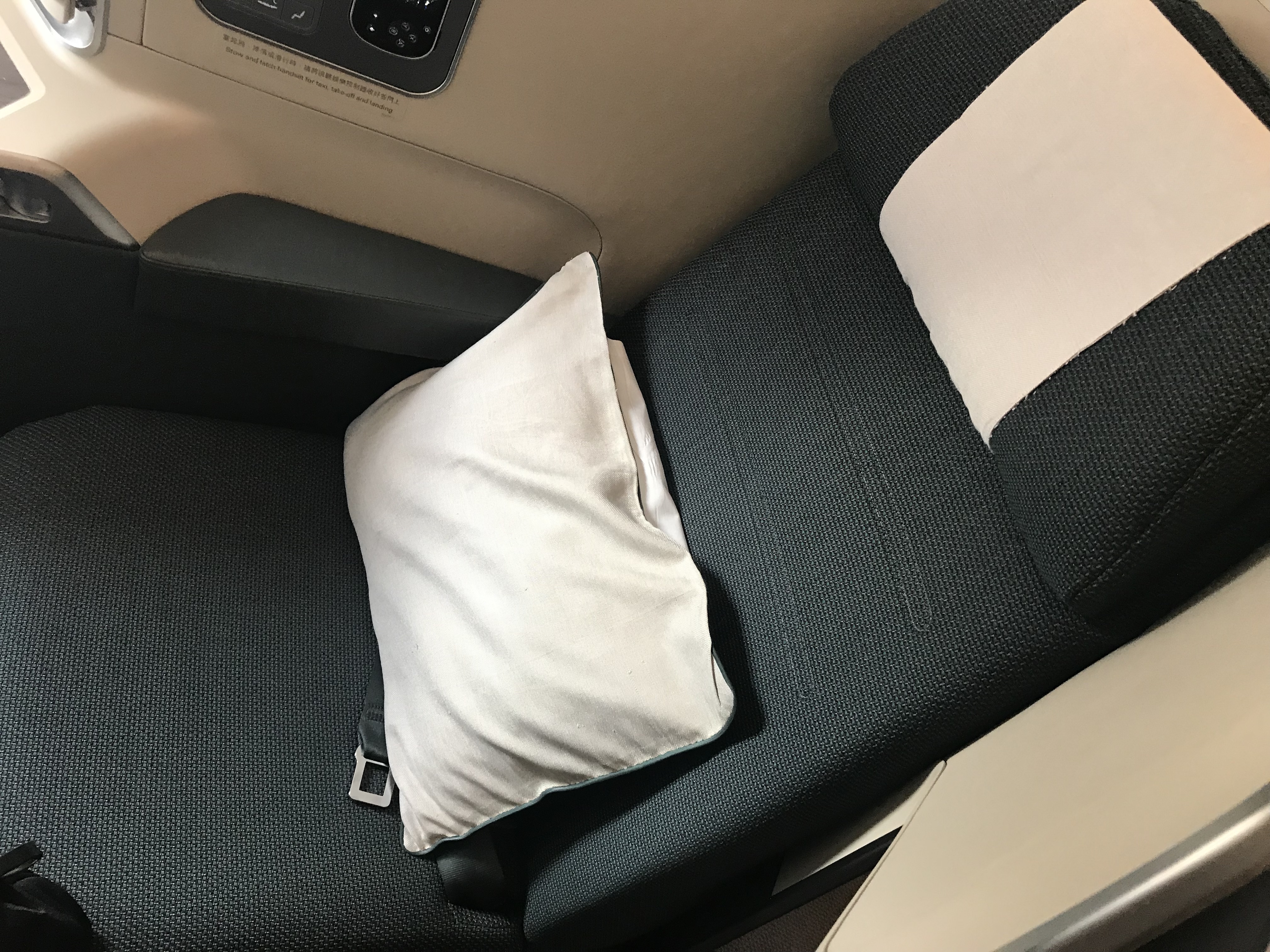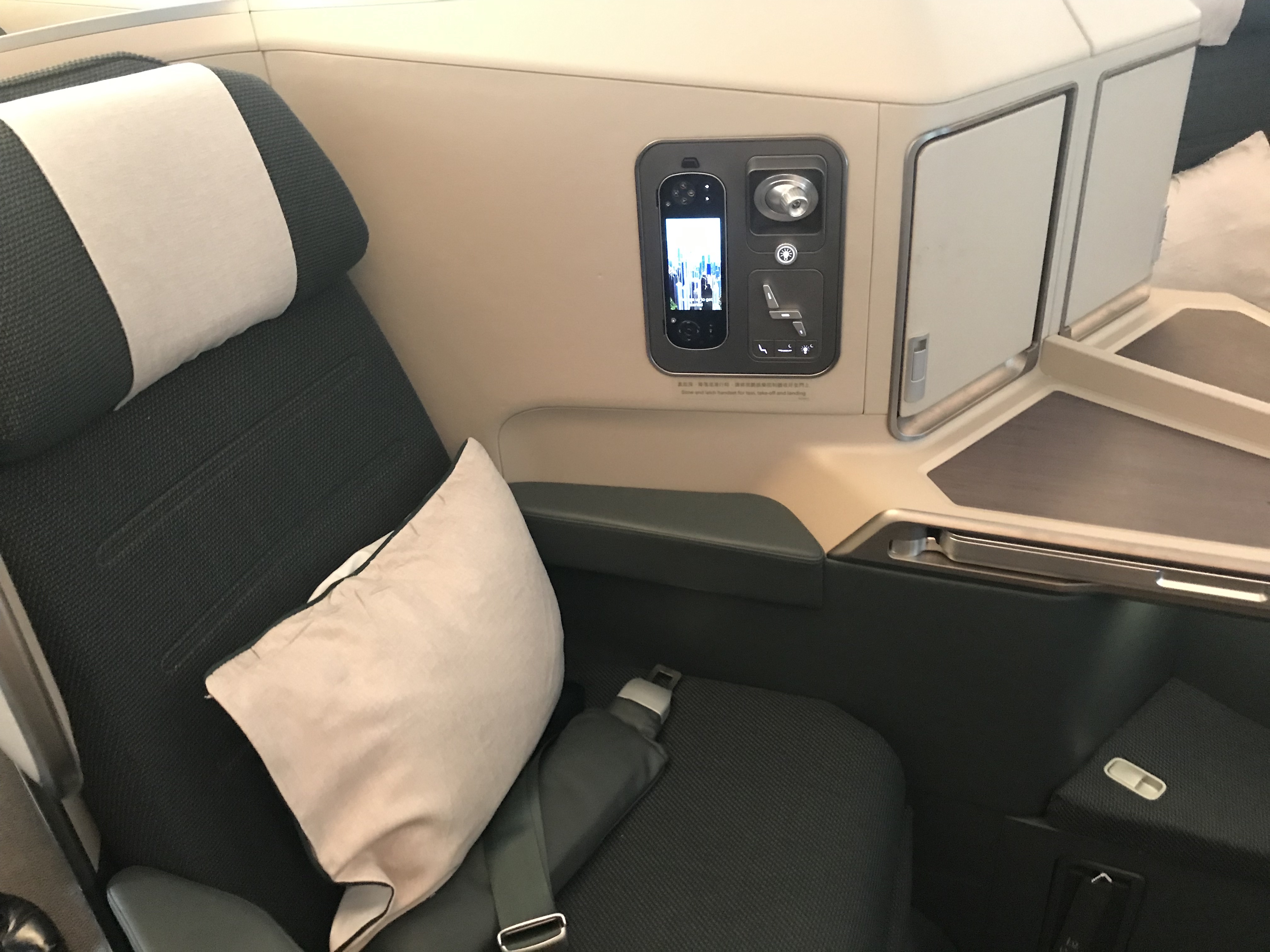 Cathay Pacific’s A350 came with a slightly updated version of their reverse herringbone Business Class seat. I found this seat to be incredibly private. I also liked the small henge they had in the footwell as it allows me to rest my foot there. The entertainment screen was large, clear, and responsive. Being able to watch the airshow on the handset was also a nice feature. Of course, any planes equipped with an on-board camera is always appreciated.