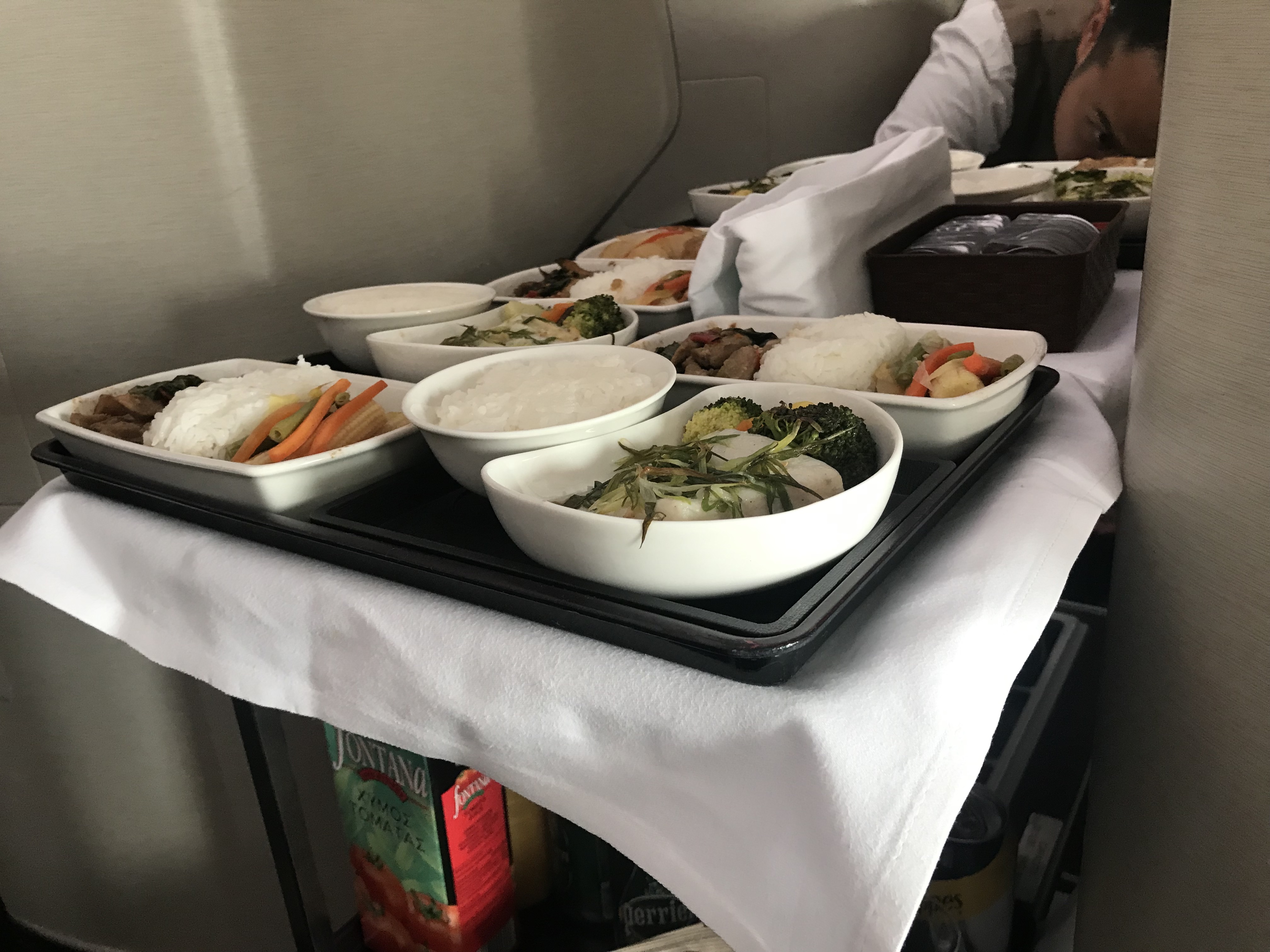 Cathay Pacific rolls down a cart with all the main courses on display: