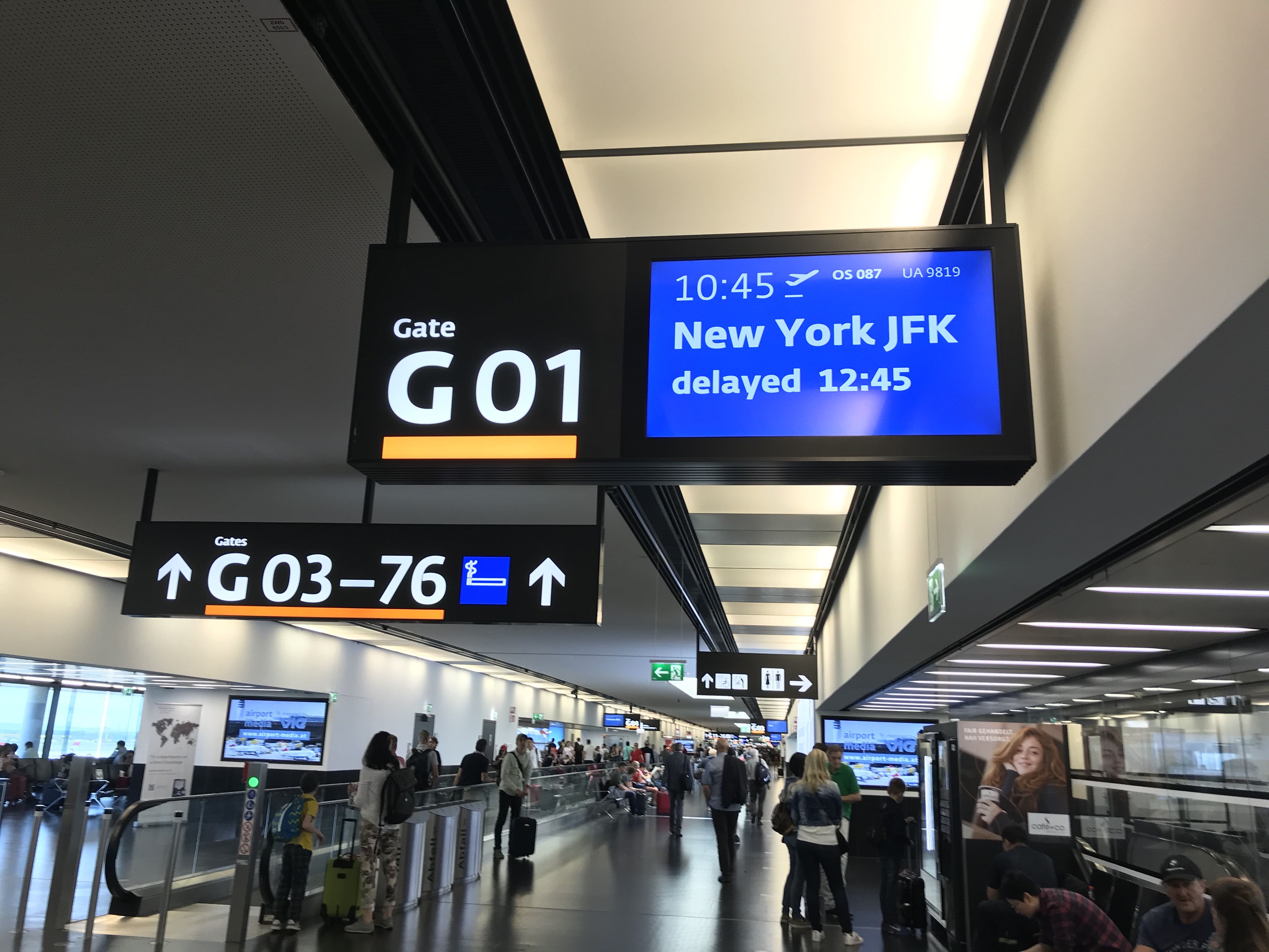 After checking the departure screens, we noticed there was something different about our OS 87 flight to New York JFK. Thus, we later found out that our flight would have a 2 hours delay, from 10:45 to 12:45, due to late incoming aircraft from New York JFK. Our transit is now 5:30 hours.