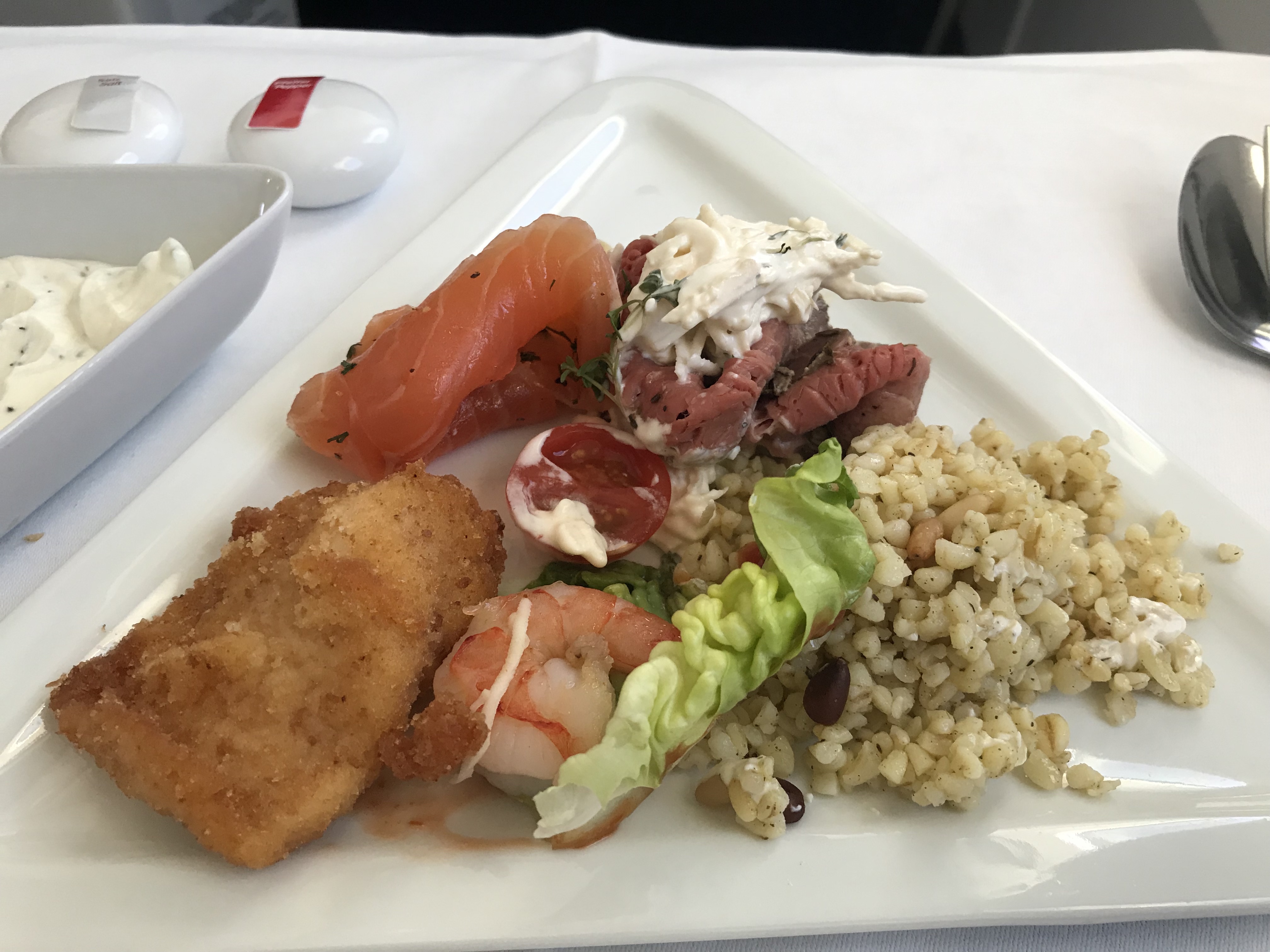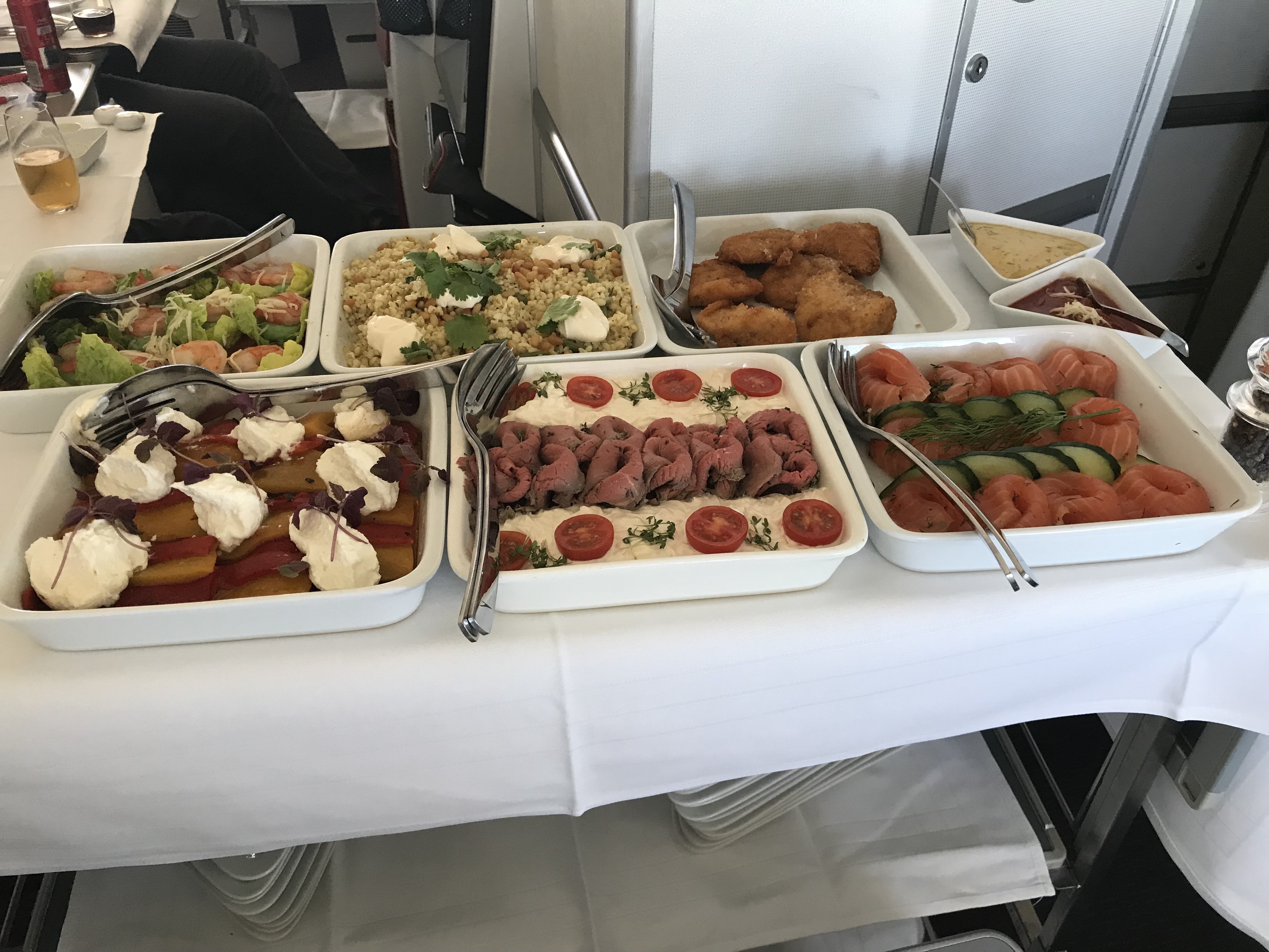 For the first course, the appetizer cart is rolled down the aisle, allowing mix and match of different items: